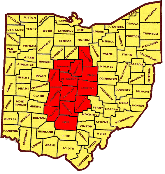 ![]() -- Traditionally includes Delaware, Fairfield, Fayette, Franklin, Knox, Licking, Madison, Marion, Morrow, Pickaway, Richland, Ross, Union Counties-- President: Gene DeWeese, Dublin Coffman High School