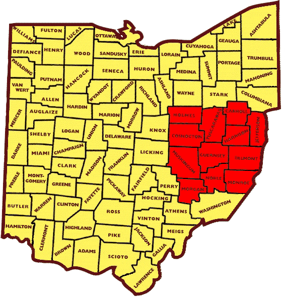 ![]() -- Traditionally includes Belmont, Carroll, Coshocton, Guernsey, Harrison, Holmes, Jefferson, Monroe, Morgan, Muskingum, Noble, Tuscarawas Counties -- President: Dave Kridler